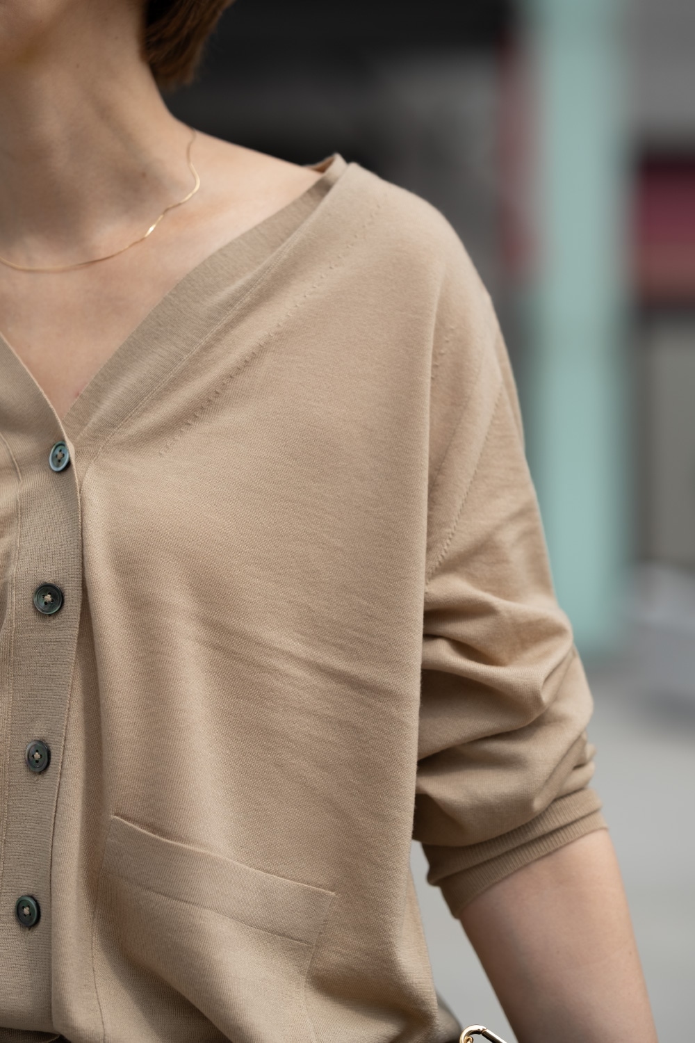 高身長をいかした着こなしが、毎回好評のYURIE。上質なシンプルカーデに、ヴィンテージ感あるブルーデニムを合わせたコーデ。ボタンを全部閉めて、1枚で潔く決まるデザインが魅力のVネックカーデは、薄手のウール100%。肌当たりも良くサラッと着れるので、秋一番にあると重宝する1枚。無骨なデニムを女性らしくまとめあげ、大人の余裕感が漂うスタイルですね。