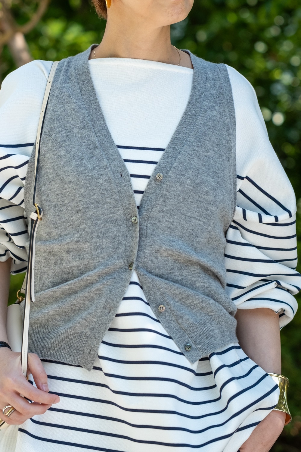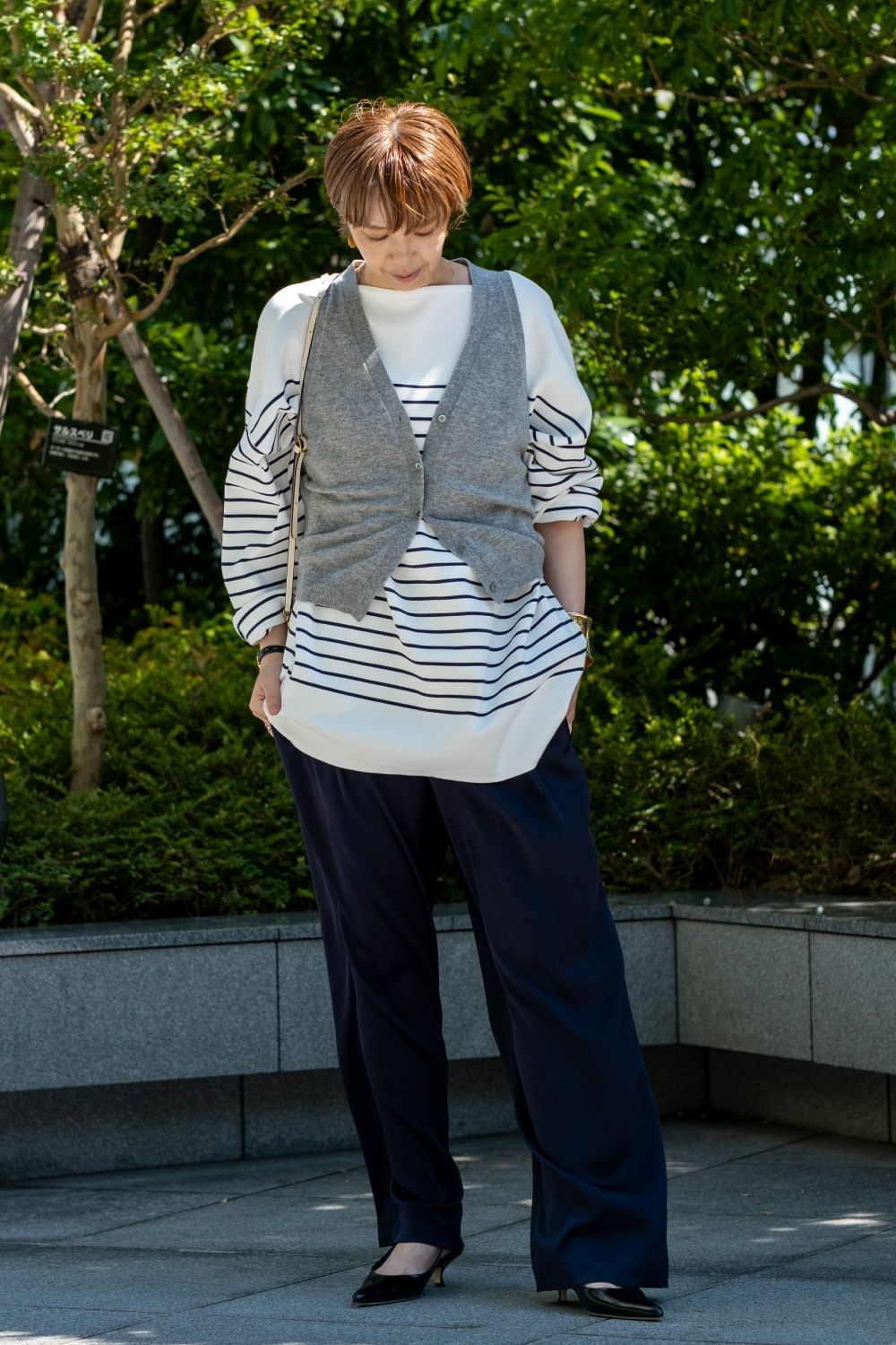 170cmの身長を活かして、存在感のあるボーダートップスをサラッと着こなしてます。そこにグレーのニットジレを重ねる事で、シンプルなボーダーニットが一気にオトナ仕様に加速。スッキリとした黒のパンツを合わせ、トップスとのバランスを調整する。ラフでいながら、きちんと感も出せる、オトナのレイヤードスタイルのお手本です。