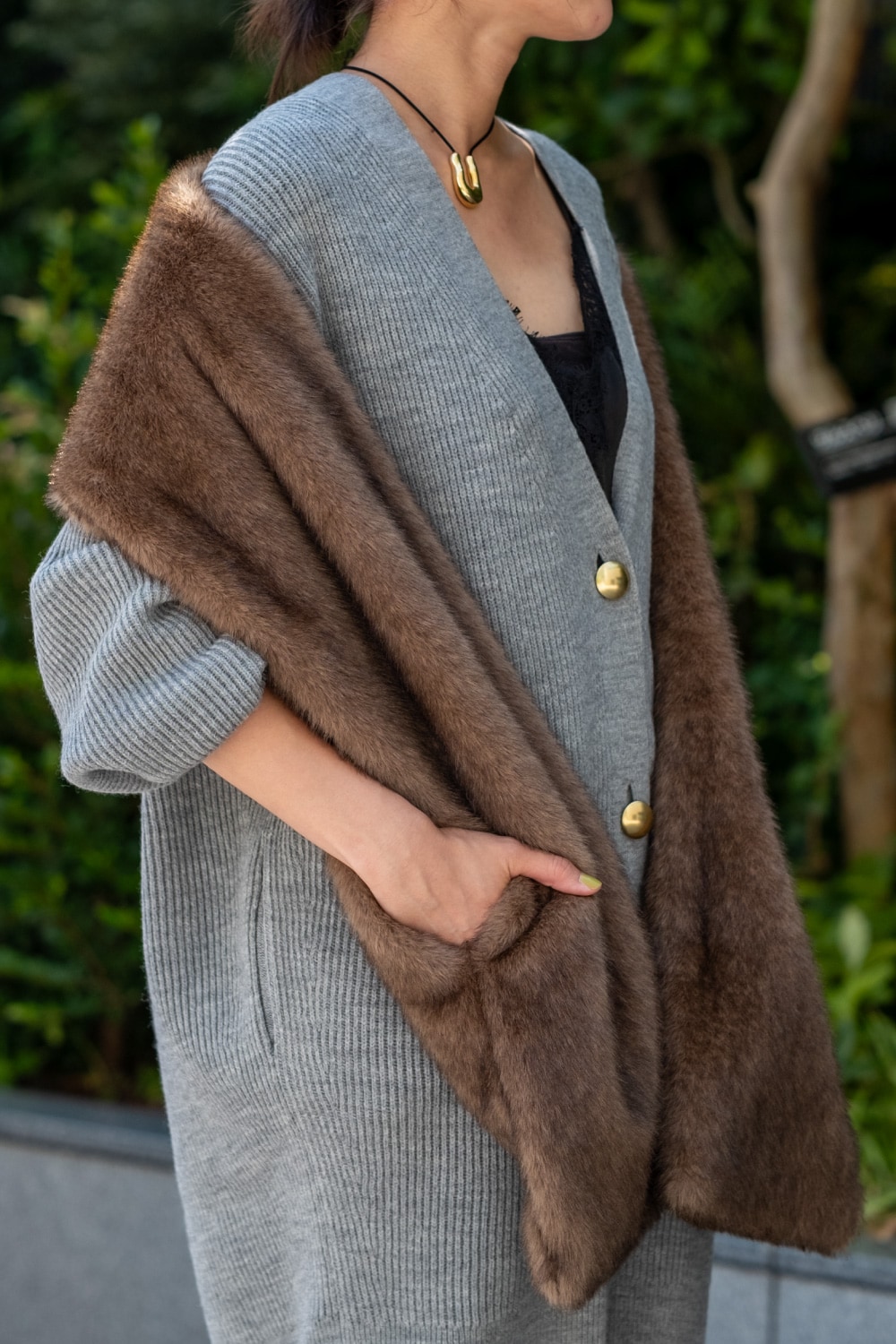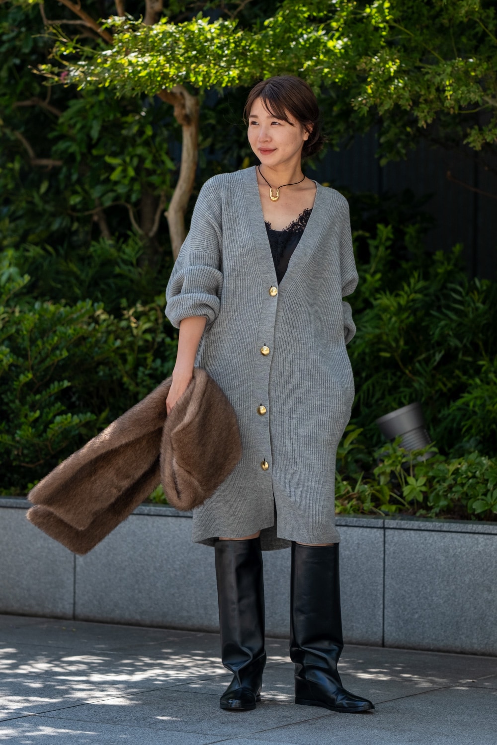 VMDらしく、シルエットや質感のバランスで魅せるRisaのこの日のコーデ。重厚感ありつつ重すぎない、落ち感のあるロングカーデをさらっとワンピース仕様で。足元今年注目のロングブーツで引き締めてます。シンプルな深Vから覗くレースキャミや、アクセ使いにも注目。さらにファーストールを加え、温かみとシーズンムードが高まるスタイリングですね。