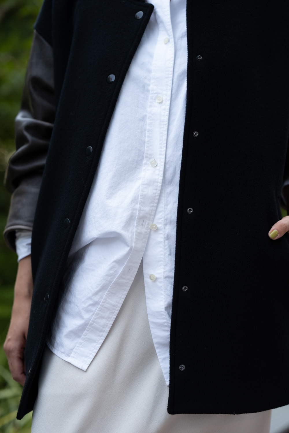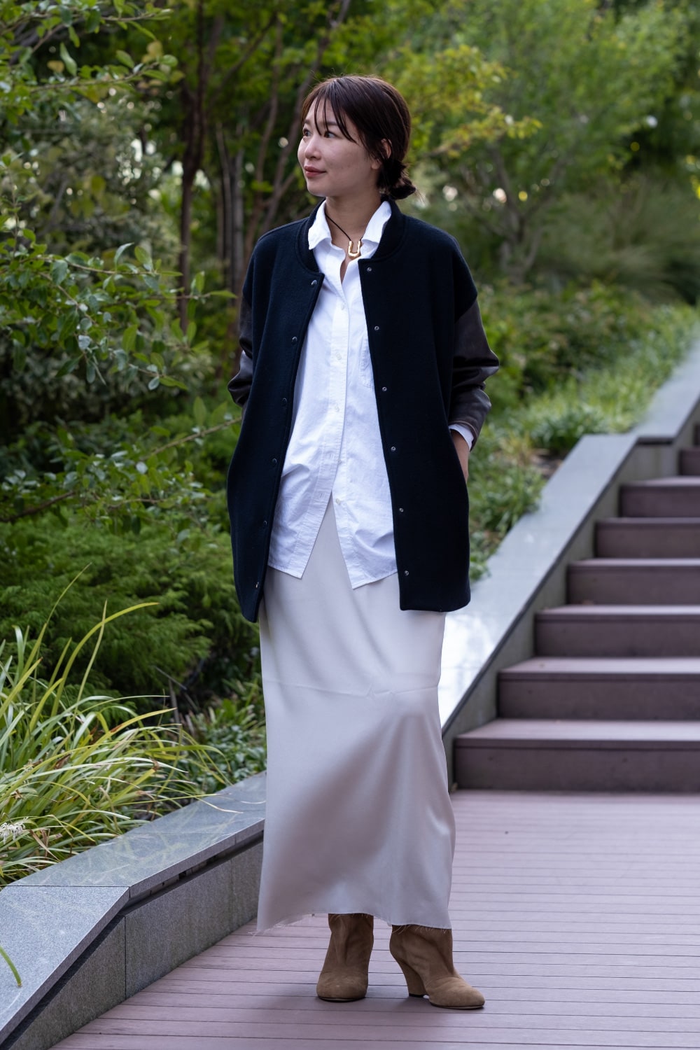 レザーの重厚感とウールの柔らかさを掛け合わせたコンビスタジャン。スポーティーな印象のスタジャンも、素材感とデザインに拘ることで、ぐっとオトナムードに。中には白シャツを合わせクリーンにまとめ、足元はブーツをチョイス。重くなりすぎないように、ベージュのスエードで秋らしさを取り入れてます。カジュアルをベースにしながらも、品の良さがしっかり残るスタイリングに。