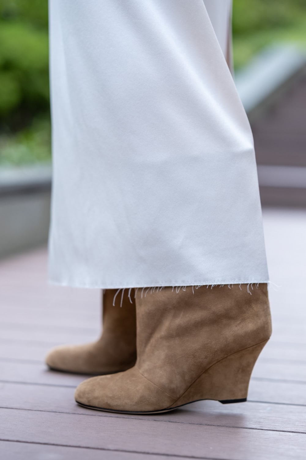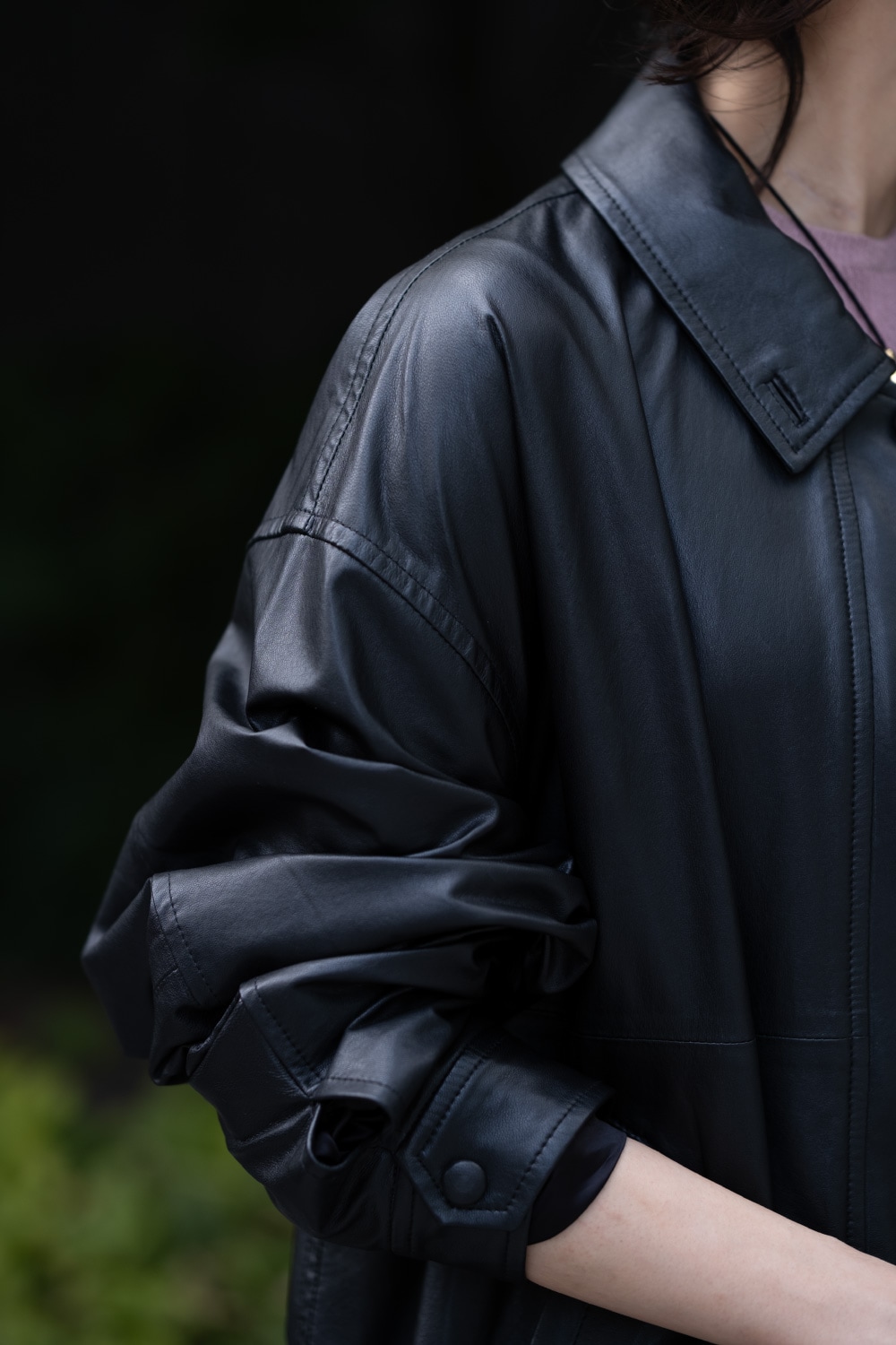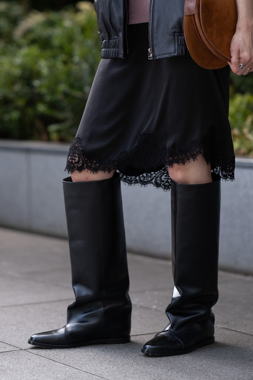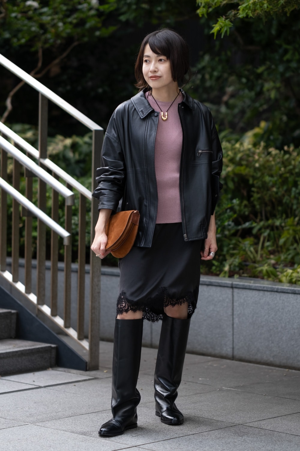 新作のラムレザージップブルゾンを羽織って、ハードなムードが漂う?と思いきや、合わせたにのは繊細なシルクレースのスカート。歩くたびに揺れて、レザーの重厚感とのコントラストが際立ちます。インナーにはほどよいピンクラメのリブニットを差し込み、さらに女性らしさをプラス。ロングブーツで全体を引き締め、辛口だけどフェミニンなオトナのスタイリングが完成。