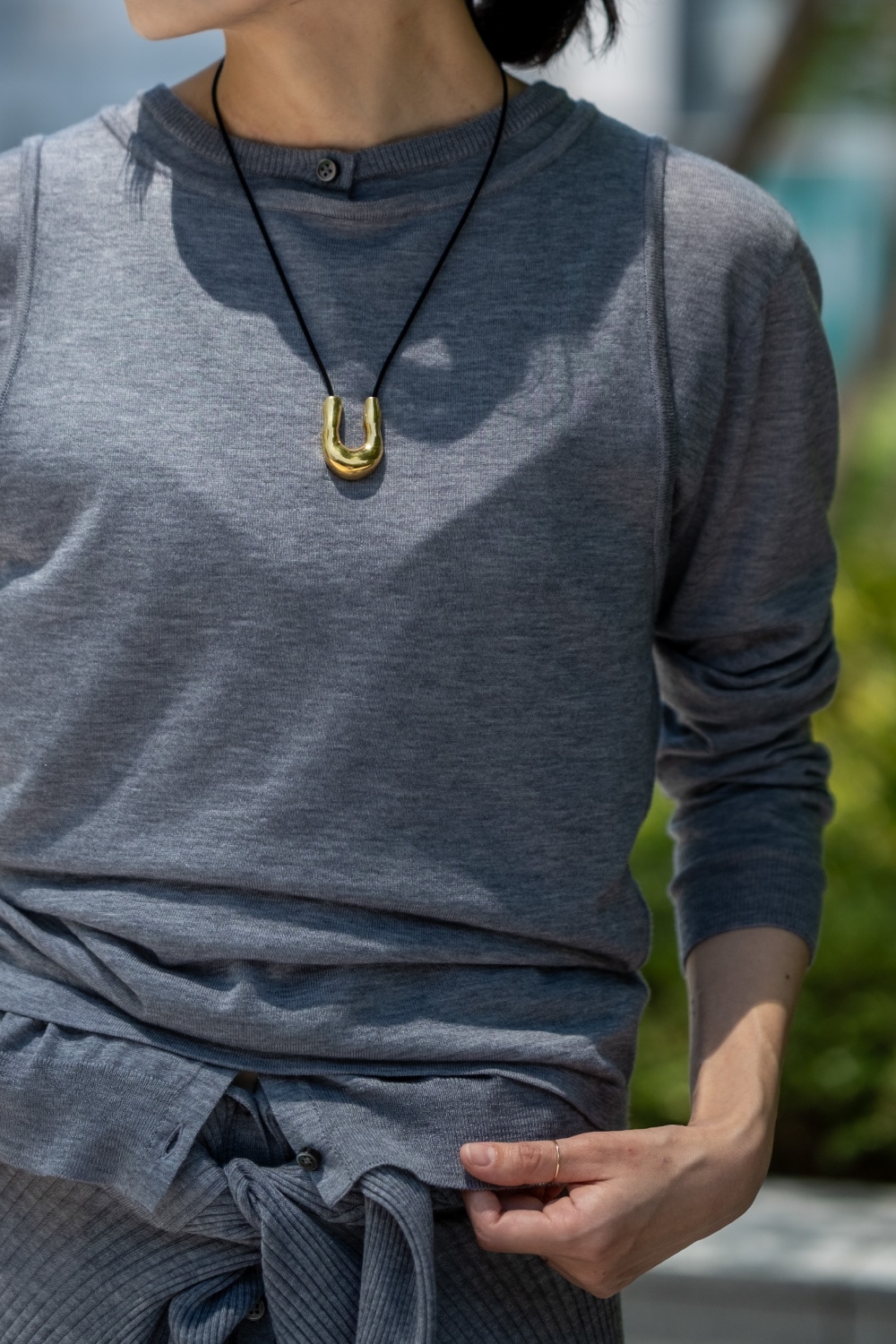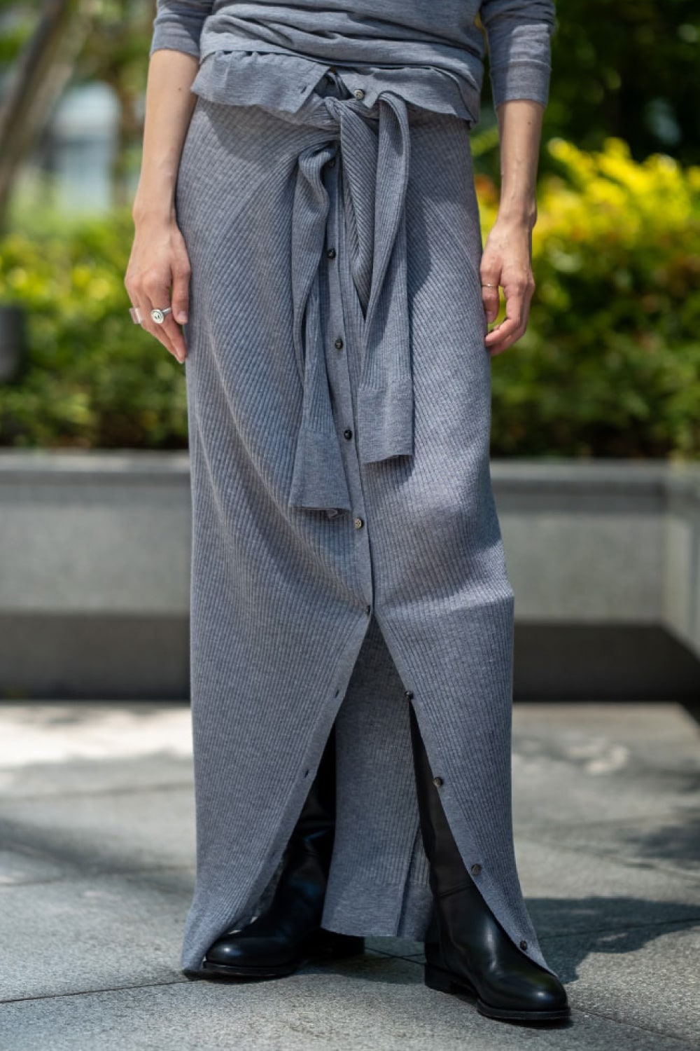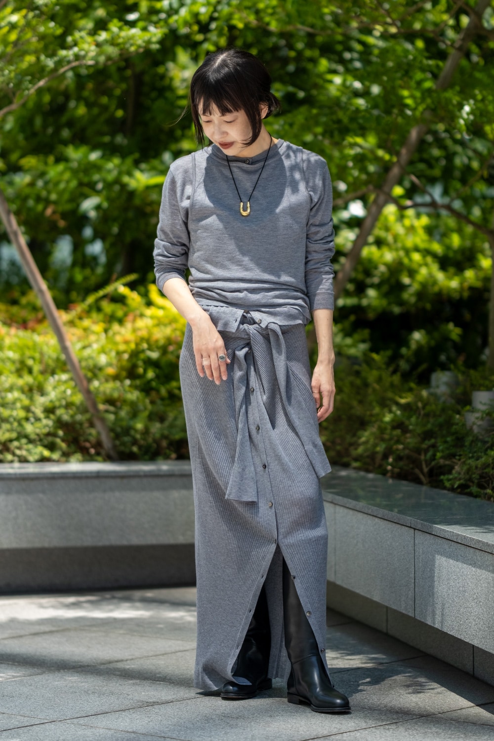 一見スカートに見えるボトムの正体。実はロングカーディガン。そしてトップスにはカーディガンとベストをいつもとは逆レイヤードで。同シリーズのニットのレイヤードが完成。本来の着方にとらわれず、アイテムを自由にアレンジする事で生まれる新しいシルエット。ワントーンながら奥行きがあり、モード感が漂う。BRILLならではの着こなしは圧巻。