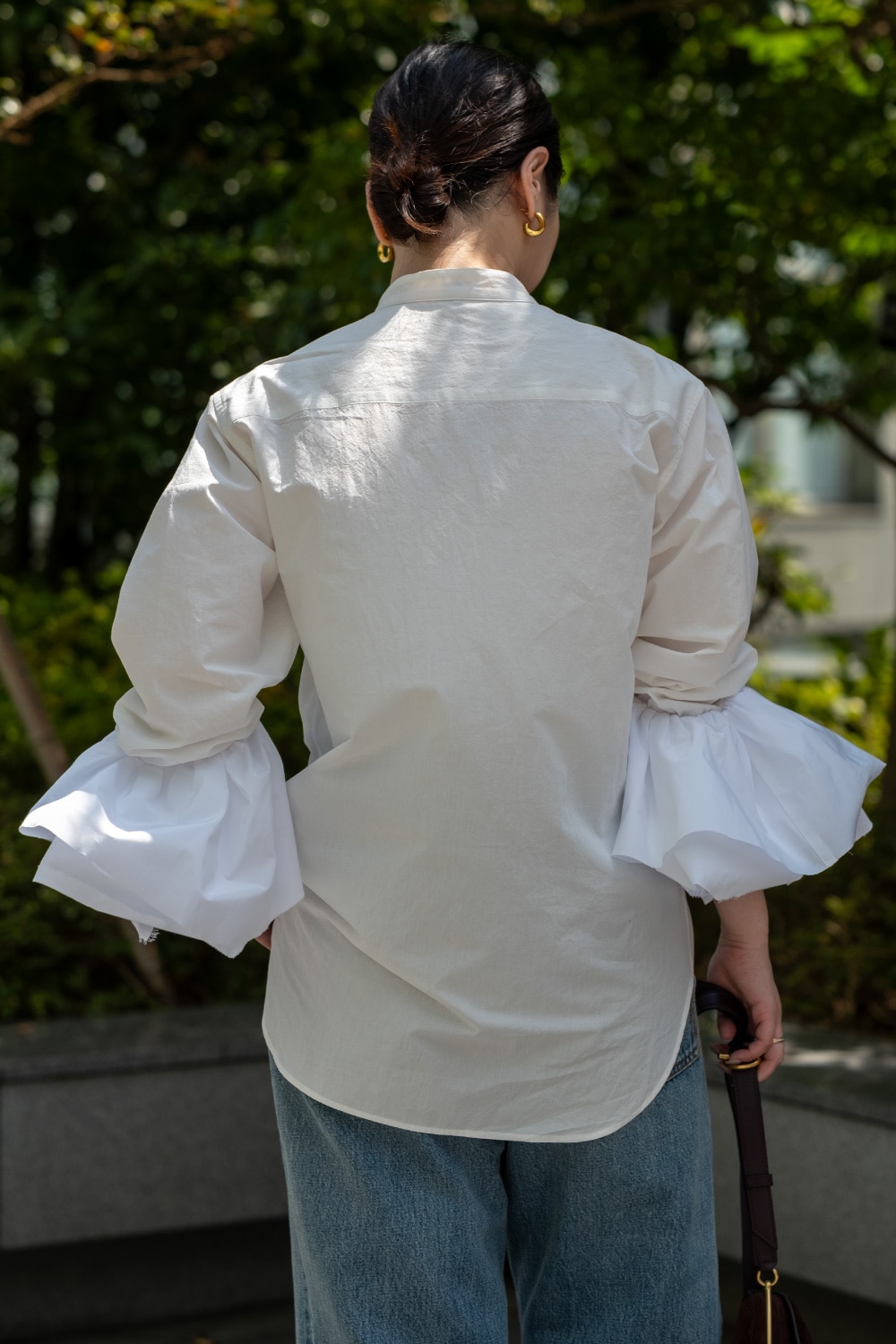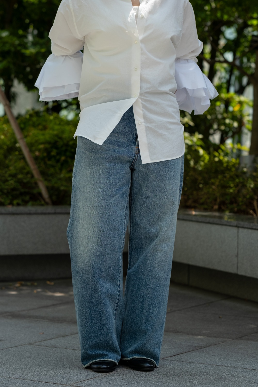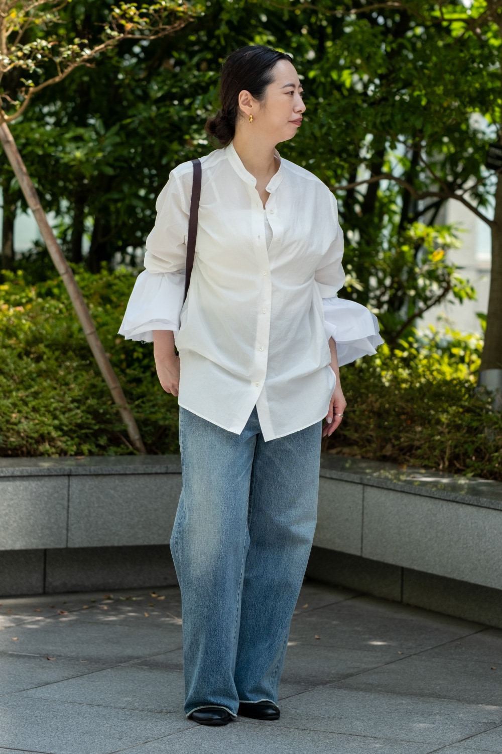 一見ベーシックな白シャツも、袖のフリルで、ぐっと華やかな印象に。動くたびに揺れる立体感が、シンプルなデニムを特別なスタイルへと引き上げてくれます。ストレートデニムでラフさを出しつつ、シャツのディティールで女性らしさをプラス。甘すぎないバランスが、オトナのクリーンカジュアルにぴったりですね。