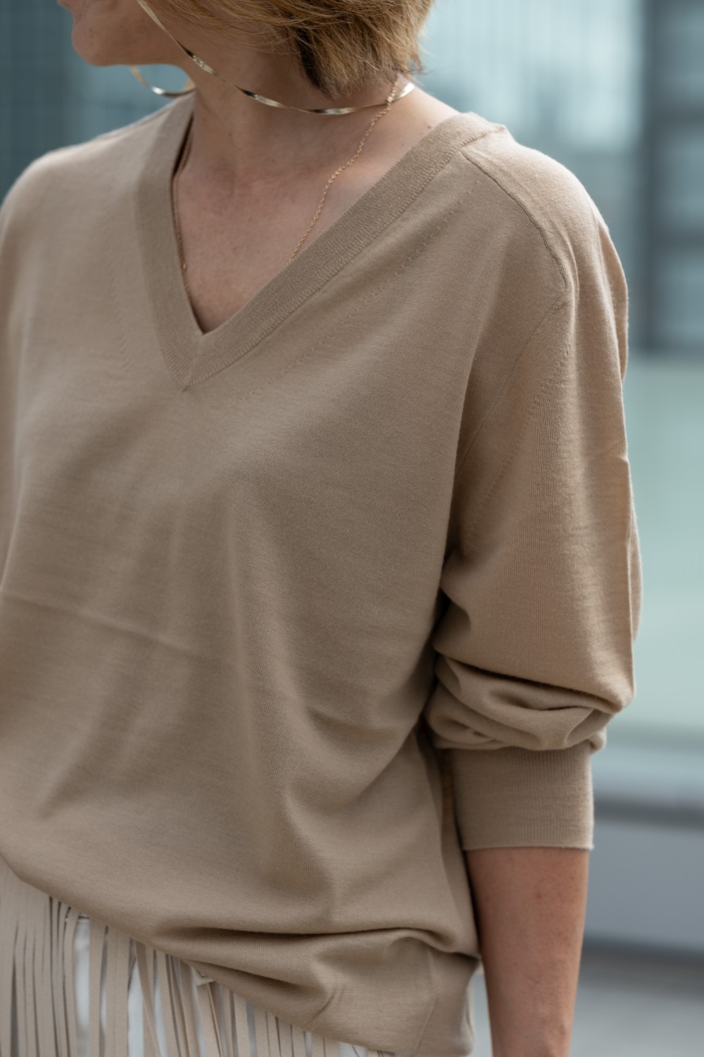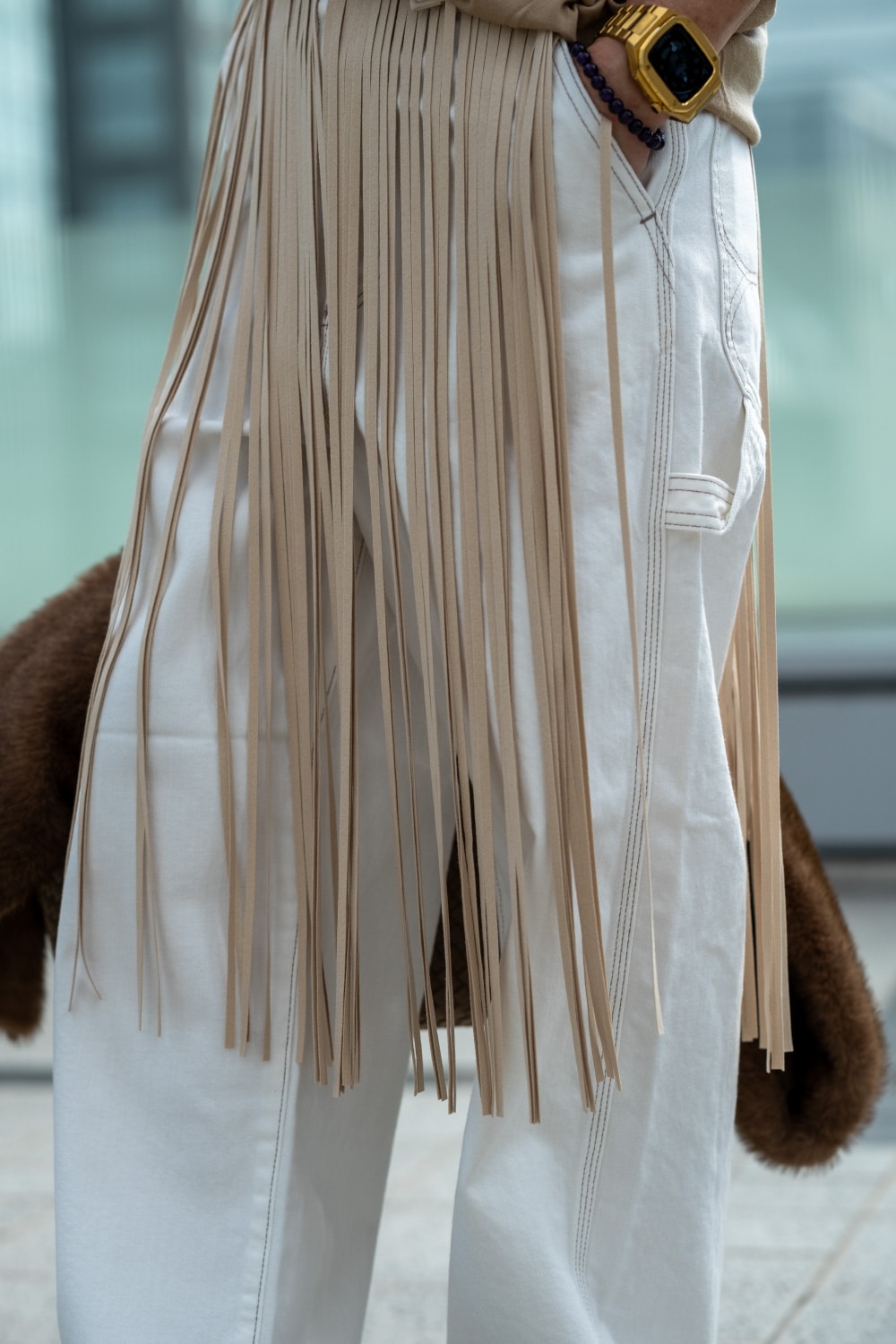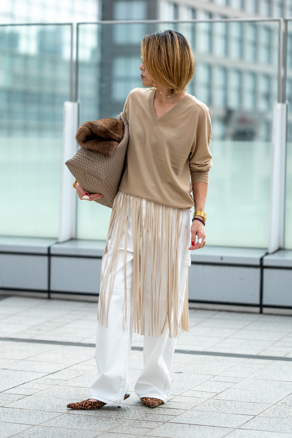 ベージュニット×ホワイトパンツのクリーンな組み合わせ。落ち着いたシンプルコーデに仕上げるつもりが…ついつい遊びを入れたくなります。そもそも、このフリンジベルトを付けたいがために生まれたコーデの様な気がします。"動きのあるアクセント"をひとつ入れるだけで、シンプルがぐっとドラマチックに変わる。常に遊び心を忘れずに…的なスタイリングです。