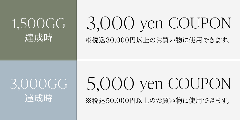 前年度の累計購入金額やステージに関係無く、本年度の各獲得GGを達成したユーザーには達成日翌日にGG達成クーポンが付与されます。