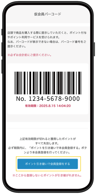 バーコードの下に表示される「ポイントを引き継いで会員登録する」をタップ