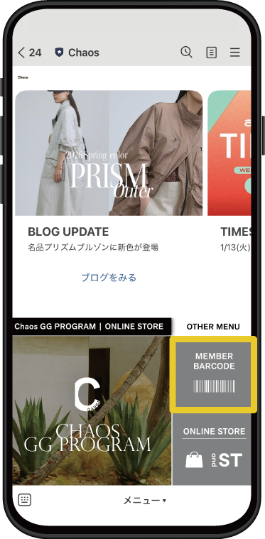 取得したクーポンは<Chaos>公式LINEのバーコードメニューからChaos GG PROGRAM MEMBERの会員証画面の下に表示される「GIFT」よりご確認いただけます。