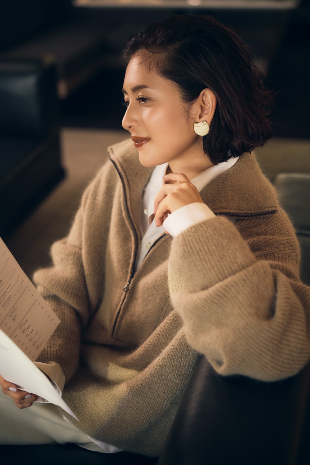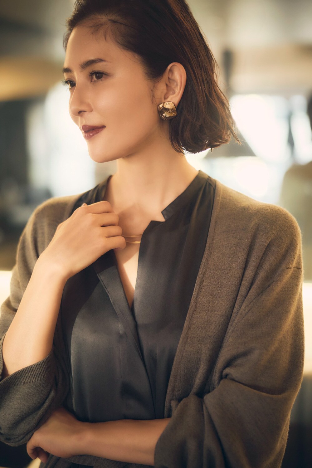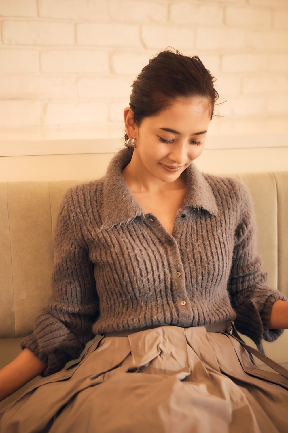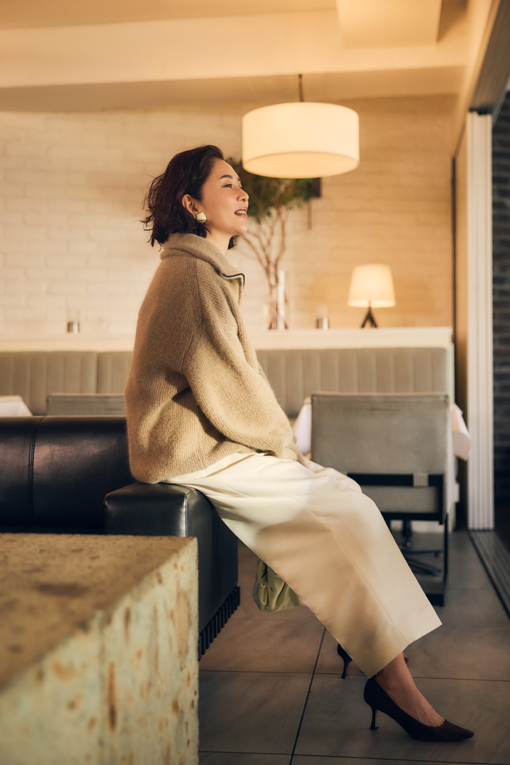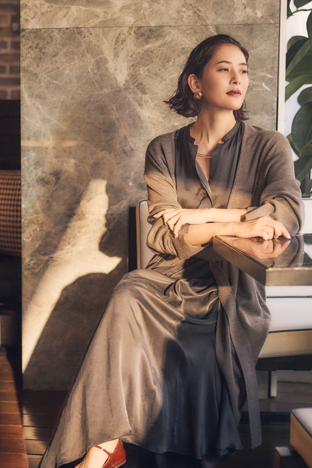 「ニットの醸し出す柔らかな雰囲気とシルクならではの艶が放つ色香を合わせれば、気品ある華やぎに。妖艶すぎずほっこりもしないからひとときをゆったり愛おしむ余裕のある大人を演出できます。」