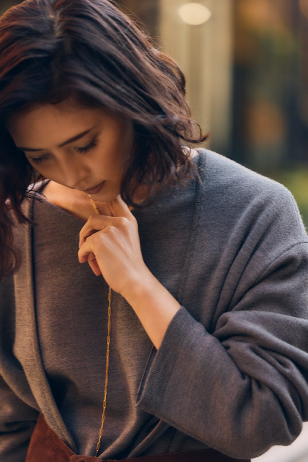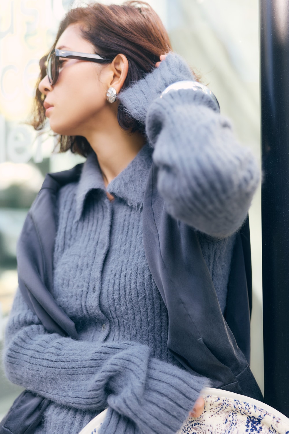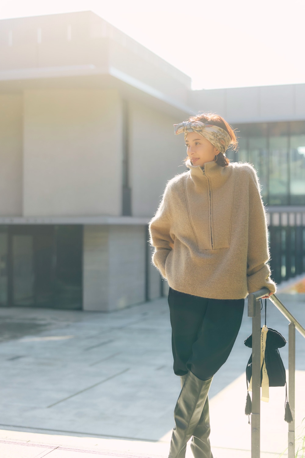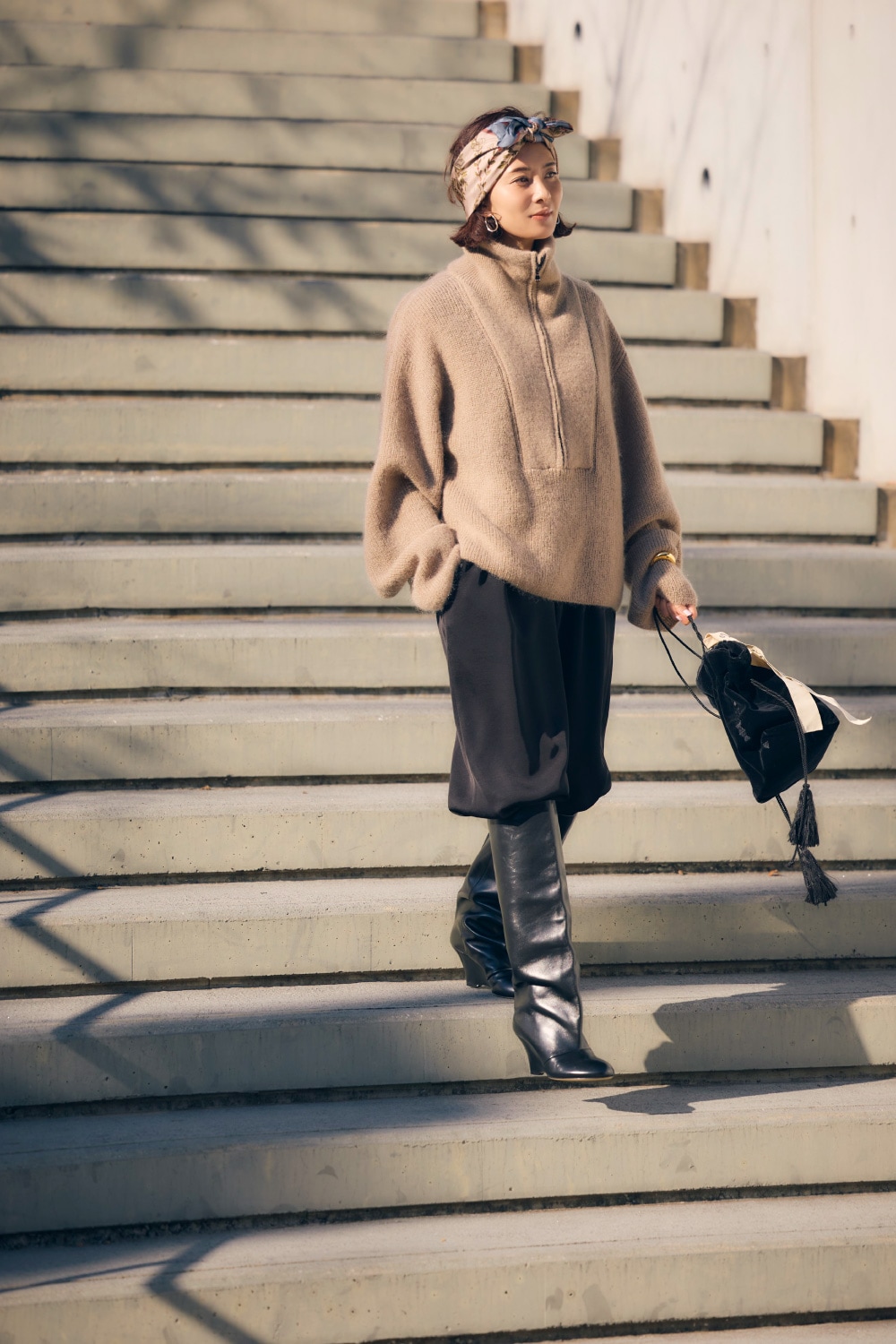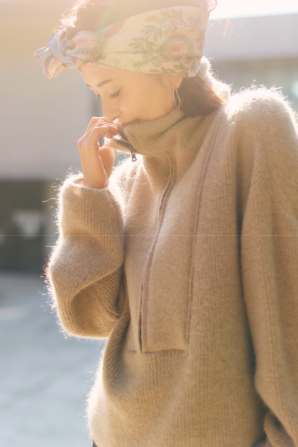 例えば日中はカジュアルに過ごし、夜はディナー、なんていう日にも、ニットを脱ぐだけで印象がサマ変わりする便利な着こなしです。頭にスカーフを巻く遊びを入れられるのも上質なニットだからこそ。」