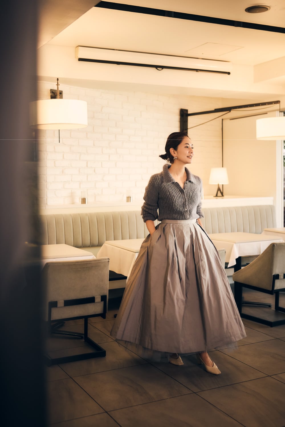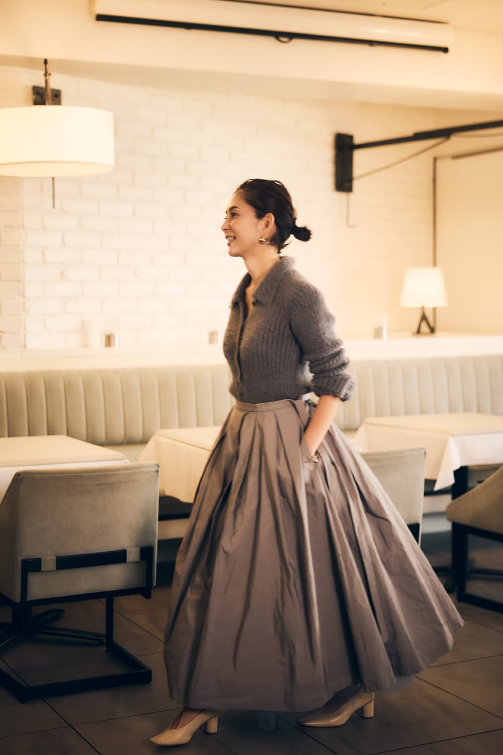 「今日は思い切りオシャレしたい!という日に意識するのはシルエット。心躍るボリュームスカートの出番です。デコルテにはクリームを重ねボタンを普段よりひとつ多く開ければ座っているときも華やかに。」
