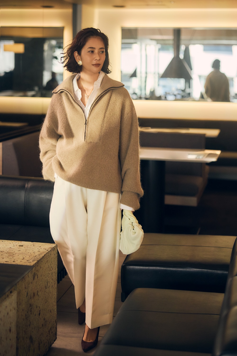 「ポロタイプを日常使いするときは、ボタンを上まで留めて知的でハンサムに着こなすのが好み。厚みのあるニットにはしなやかなボトムスを合わせ、メリハリをコントロールします。この日は私が3色買いしたお気に入りの洗えるシルクシリーズを。」