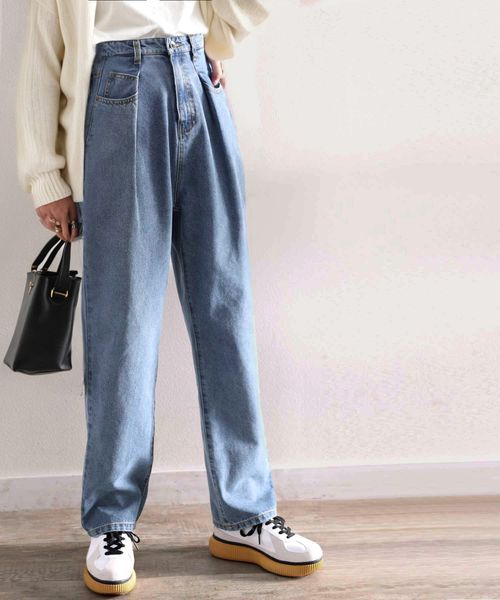 深めのタックが印象的。ハイウエストデニム&チノ タックワイドパンツcla803070