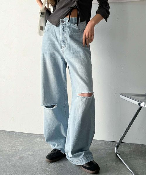 サステナブル綿100%ウエストアシメワイドストレートダメージデニムパンツce1260337
