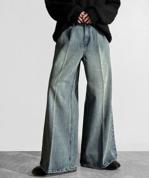 【Classical Origin】ヴィンテージ加工ワイドバギーフレアデニムパンツco1150001