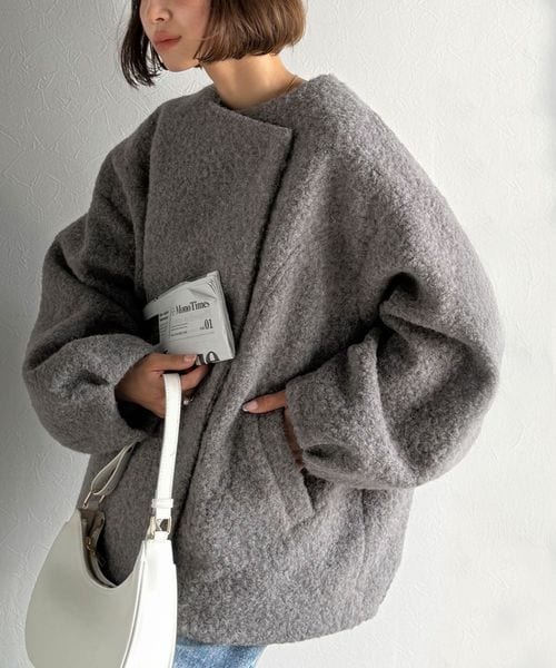 コクーンシルエットでちょこっとガーリー見せ。ノーカラーコクーンボアコートce1070173