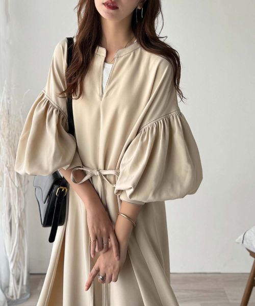 ウエストリボン使い配色ステッチキーネックワンピース(長袖)ce1265036