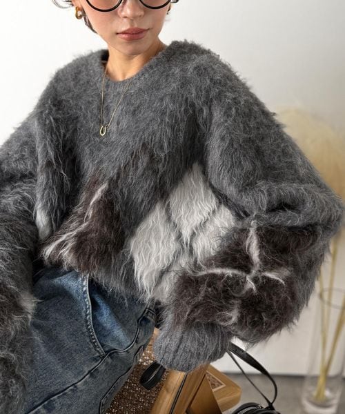 シンプルコーデに差をつける一着。長起毛アーガイル柄ニットプルオーバーce1020328