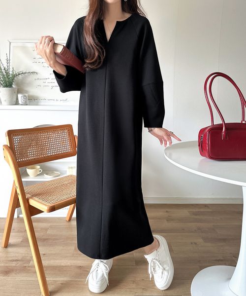 清楚にフェミニン、品よく抜け感。ランタンスリーブキーネックワンピース(ロング丈)ce1110149