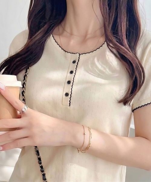 【mily bilet】パターンメッシュ素材配色スカラップヘンリーネックTシャツmi1329072
