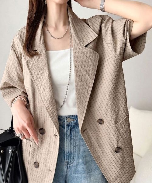 サッカー素材ダブルテーラード半袖ジャケット(セットアップ可)ce1010575