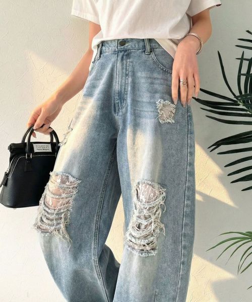レースにキュン!ラフに攻めて。綿100% レース付きダメージデニムカーブパンツce1015098