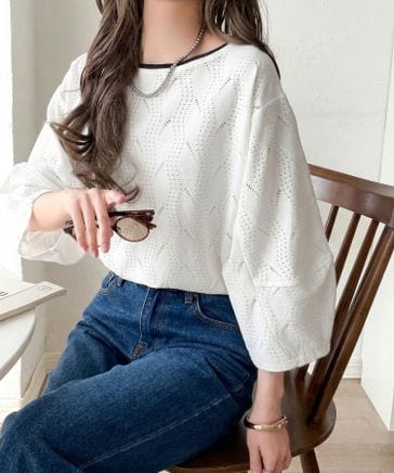 さりげない配色で、一枚でサマになる。配色7分袖ジャガードトップスce1050377