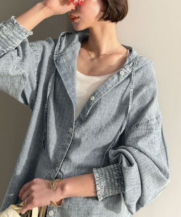 【Javaコラボ】コットン100%フード付き袖シャーリングシアーデニムシャツ jv1010600