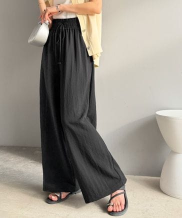 さらり、軽やか。レーヨン素材ウエストギャザーフレアシルエットワイドパンツce1015084
