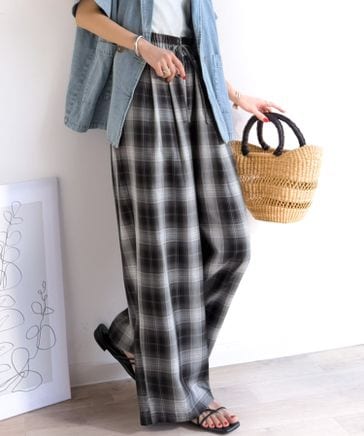 リラクシーなニュアンスたっぷり!オンブレチェック柄ワイドイージーパンツce1070217