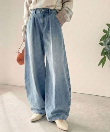 こなれ度アップのヴィンテージ風。変形タック使いワイドデニムパンツce0940245