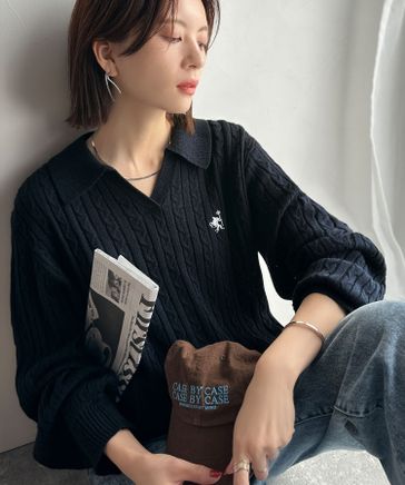 ”品よく華やぐ”。大人のマストバイニット。胸刺繍ケーブル編みポロ襟スキッパーニットce1050308
