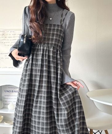 チェック柄ダブルストラップバックリボンキャミワンピ(ロング丈)ce1010526