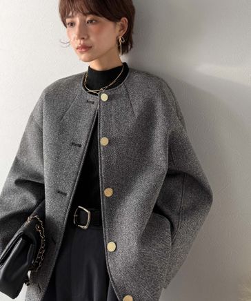 コクーンシルエットでちょこっとガーリー見せ。ノーカラーコクーンボアコートce1070173