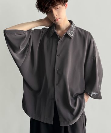 エンボス加工サテン素材 衿刺繍 ビッグシルエットシャツco1010022