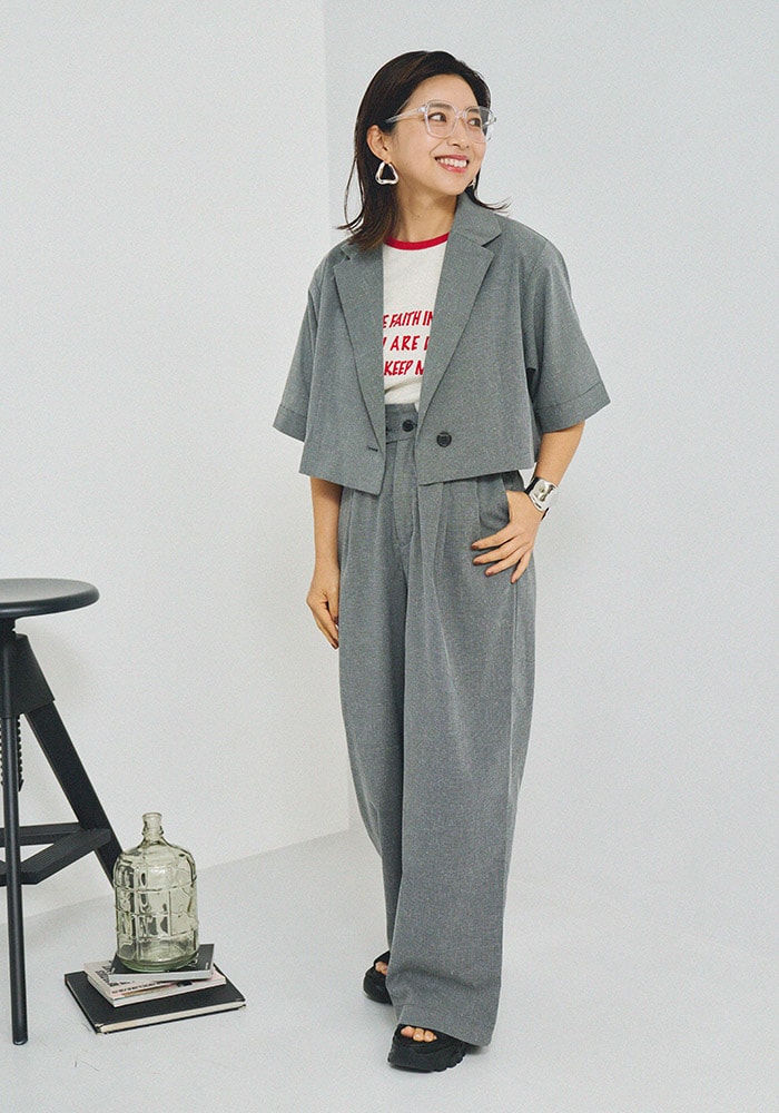 襟つきのシャツを選び、モノトーンのリンクコーデに。
