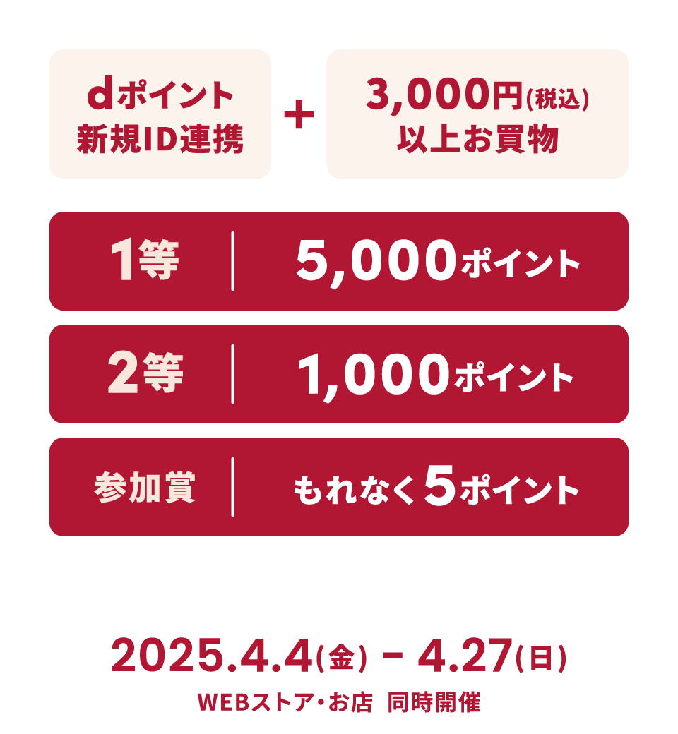 キャンペーン期間中にエントリー、かつ and ST会員IDとdアカウントを連携していただいたうえで、全国のアダストリアの実店舗もしくはand ST WEBストアにて3,000円(税込)以上ご購入いただいた方の中から抽選で最大5,000ポイントをプレゼントいたします。