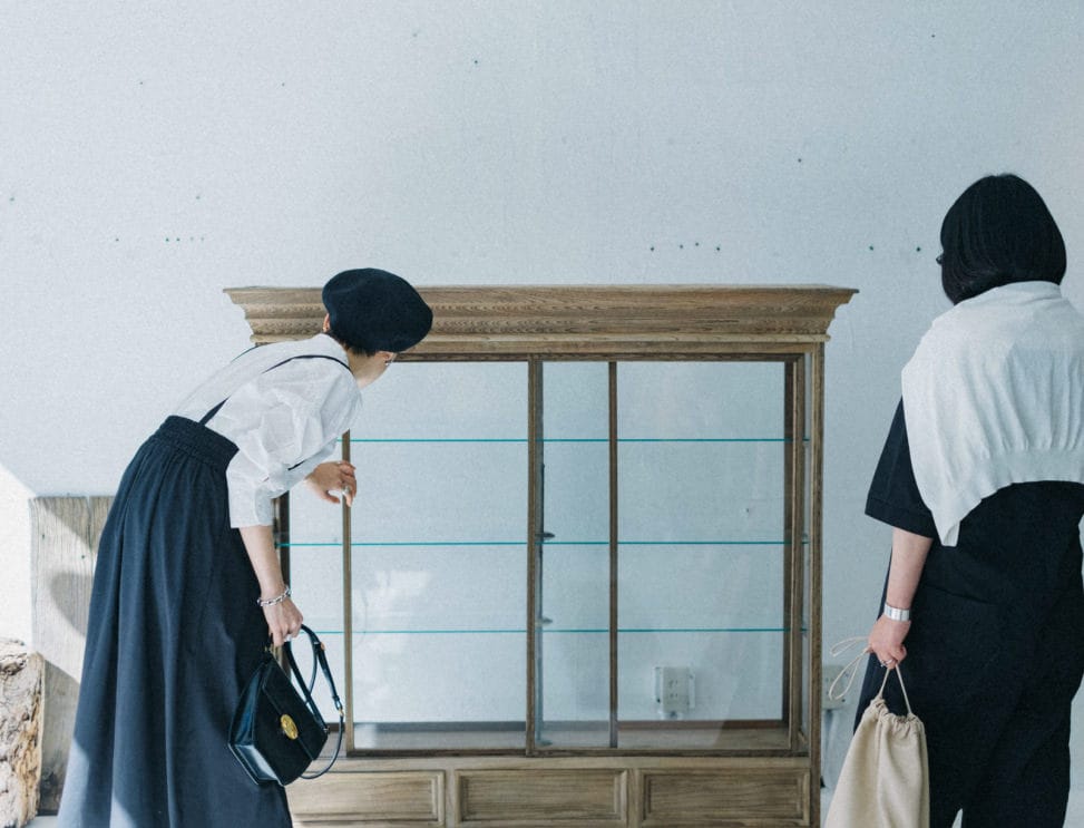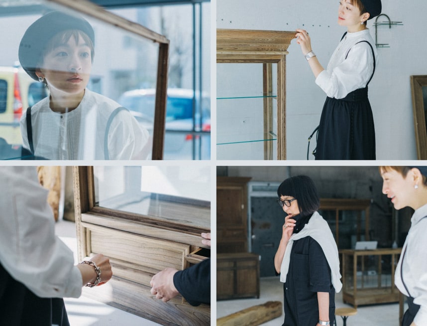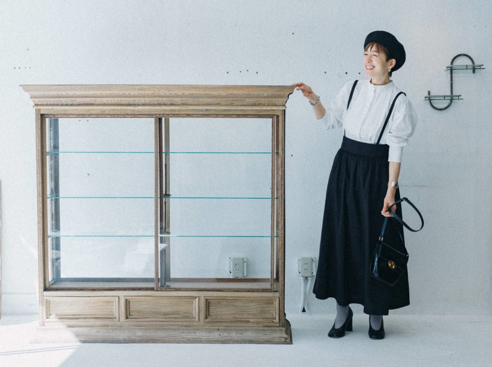 訪れたのは、東京・富ヶ谷にあるDOUGUYA。明るい店内には、時を経ることで熟成された端正な美しさの家具や雑貨が並ぶ。お目当ては、高山さん愛用のうつわを収めるための飾り棚。「ガラスの家具って、中に入れるもの次第で表情が変わるんです。収納するというよりも、飾る感覚で使って欲しいですね」(石井さん)。