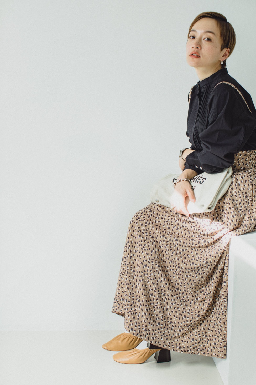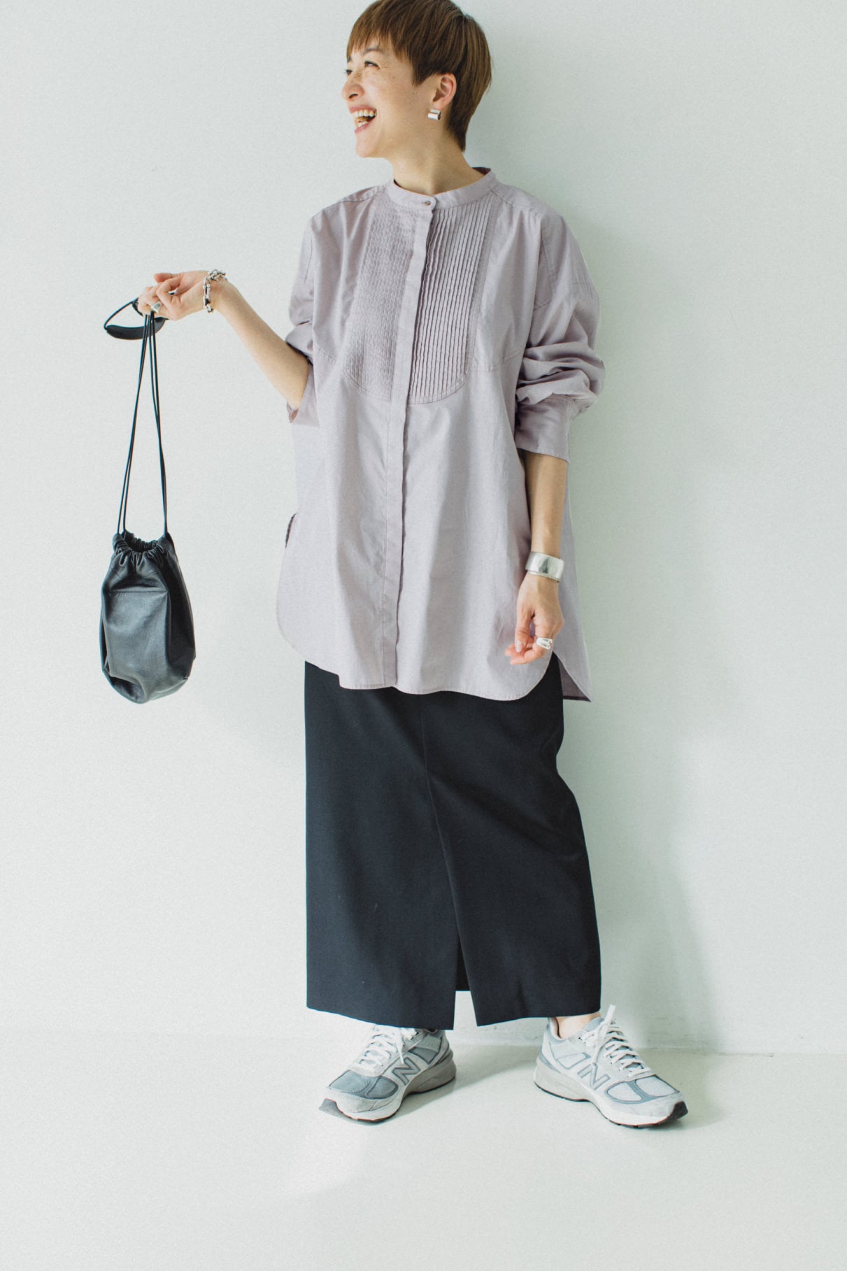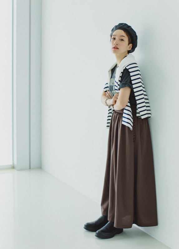 きれいなシルエットの秘訣はハイウエストのスカート。