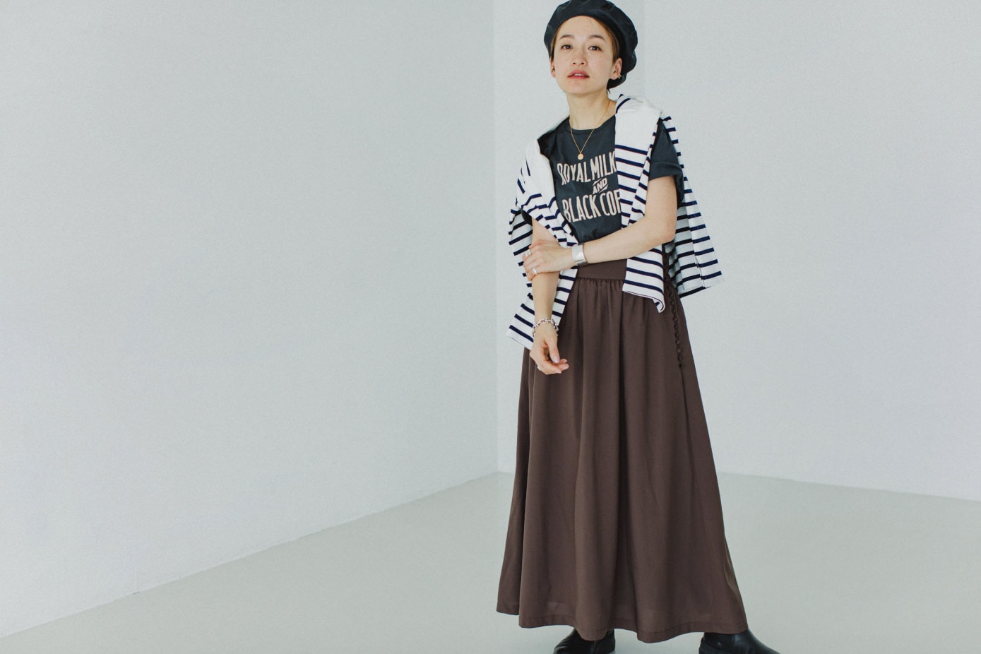 さらりとした素材とシックな色味で都会的な印象。