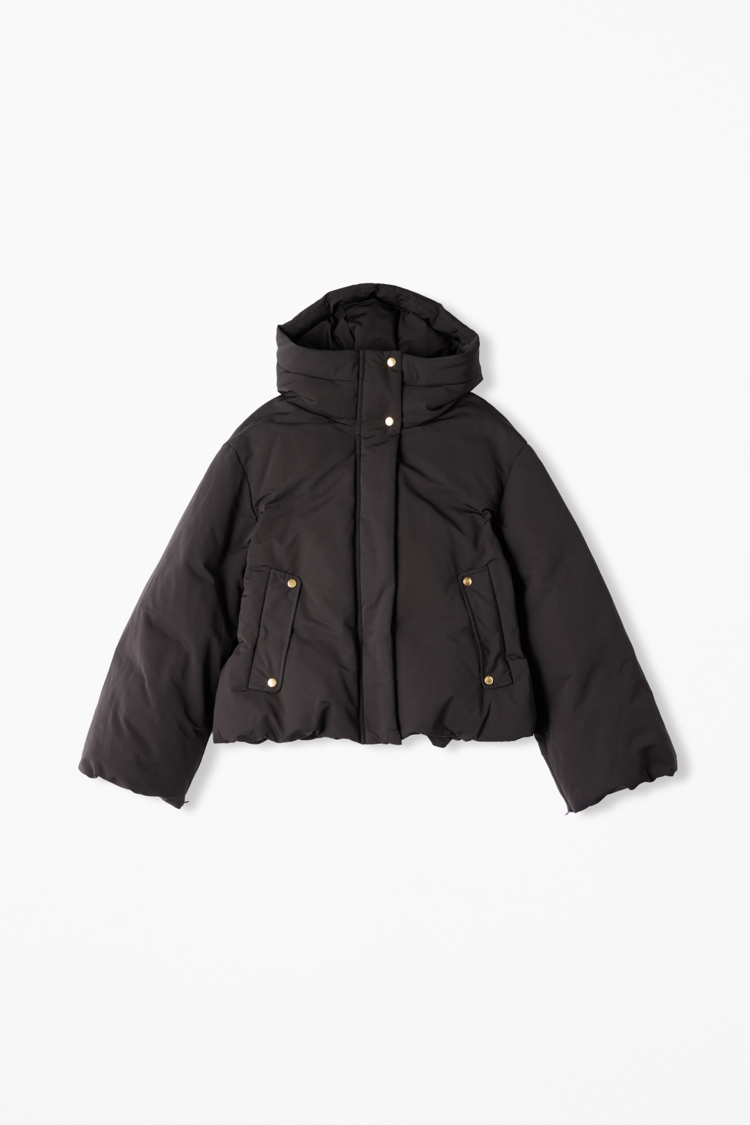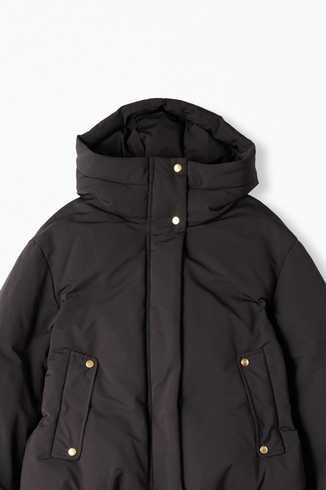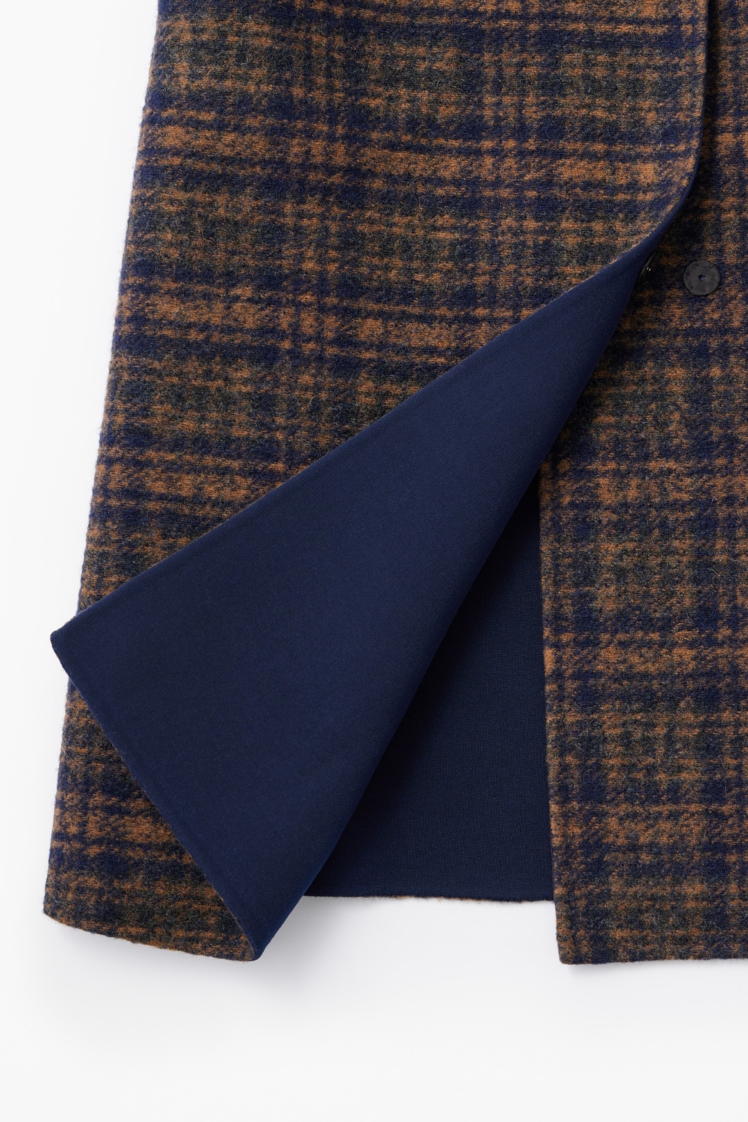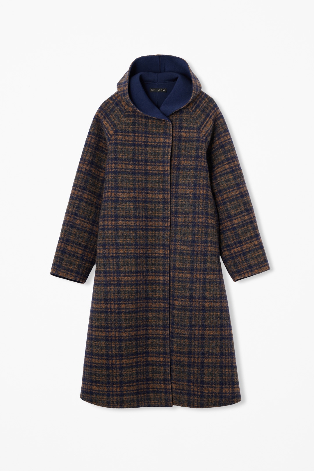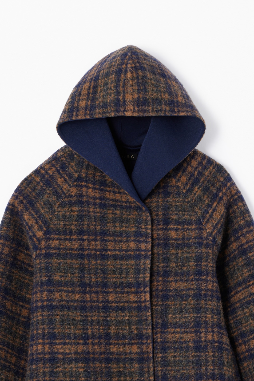 イタリア製のインポート素材を使用した、ネイビーとキャメルのトラディショナルなチェック柄。 構築的で丸みのあるフォルムが特徴で、しっかりとした見た目ながら軽い着心地も魅力。 立体的なフードが顔周りを華やかに演出し、カジュアルな装いのアクセントに。