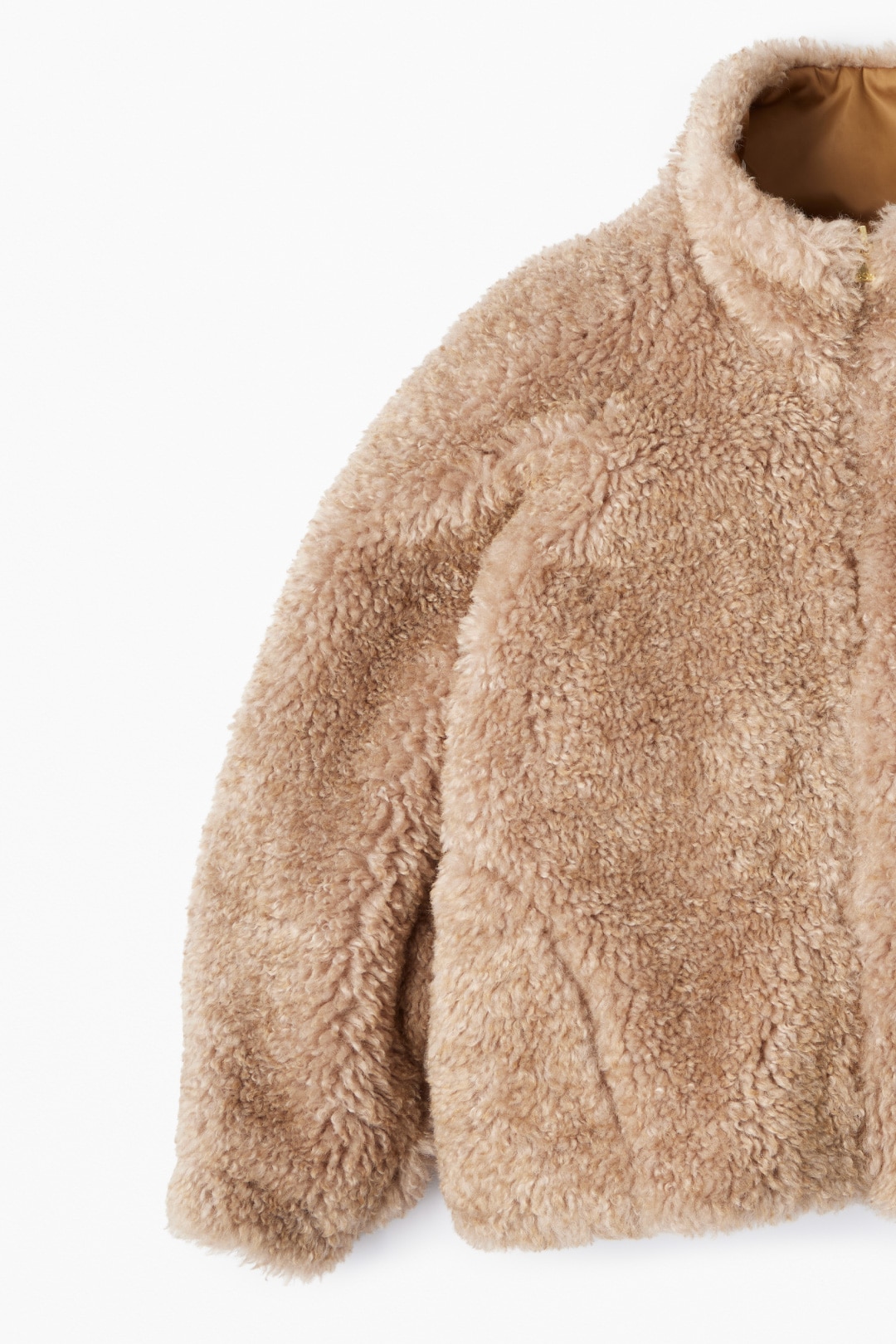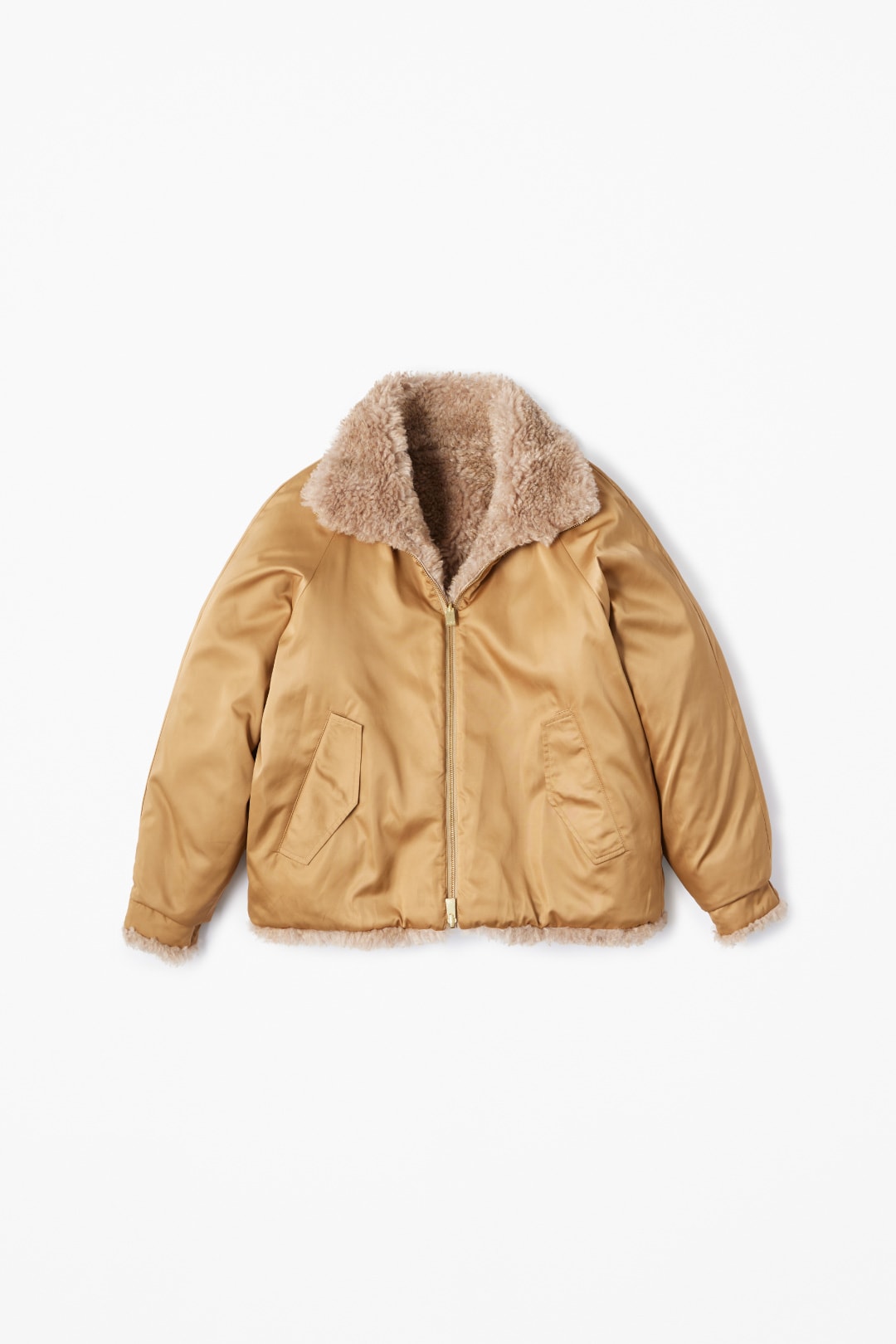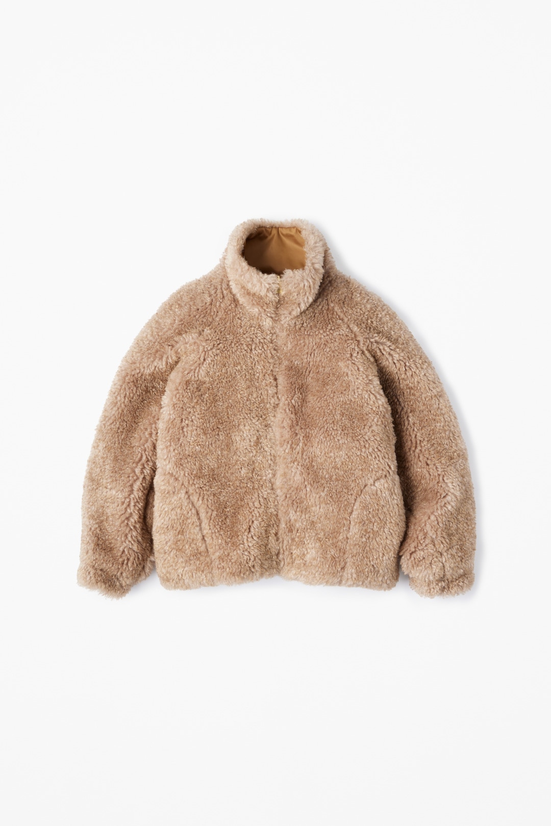 表面はリアルシープ風のカーリーヘアのフェイクファー、裏面はイタリアのリモンタ社が監修した上品なタフタ生地を使用。ファーを表にすると防寒性の高い可愛らしいスタンドカラーがデザインのポイントに。裏返してMA-1風に着こなせば、衿や裾から覗くファーがさりげない洒落感を演出。