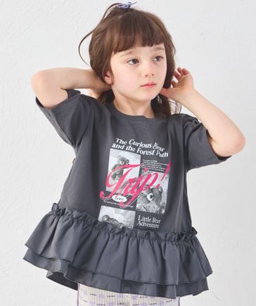 【綿100%】ガールズ 裾フリル アニマル ロゴ ペプラムTシャツ