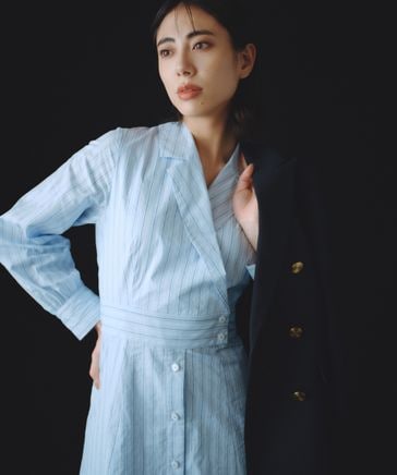 【WOMENS】ボリュームスリーブ/ストライプシャツワンピース