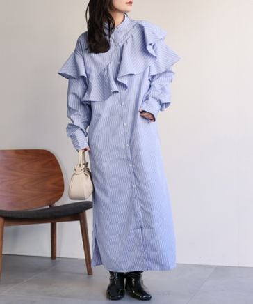 ラッフルフリルバンドカラーワンピース / ストライプ シャツワンピース
