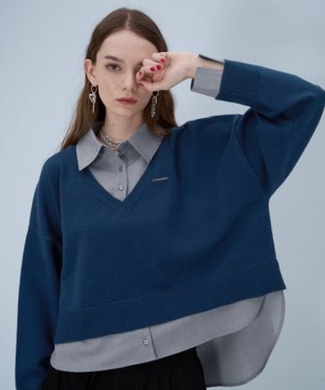 【一部カラーSET UP対応 LADIES】シャツドッキングVネックハイゲージニット