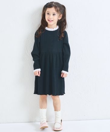 【リブコットン100】ガールズ レースフリル フレアテレコワンピース