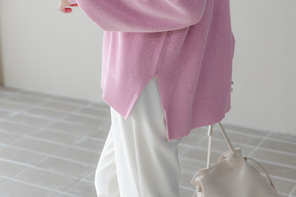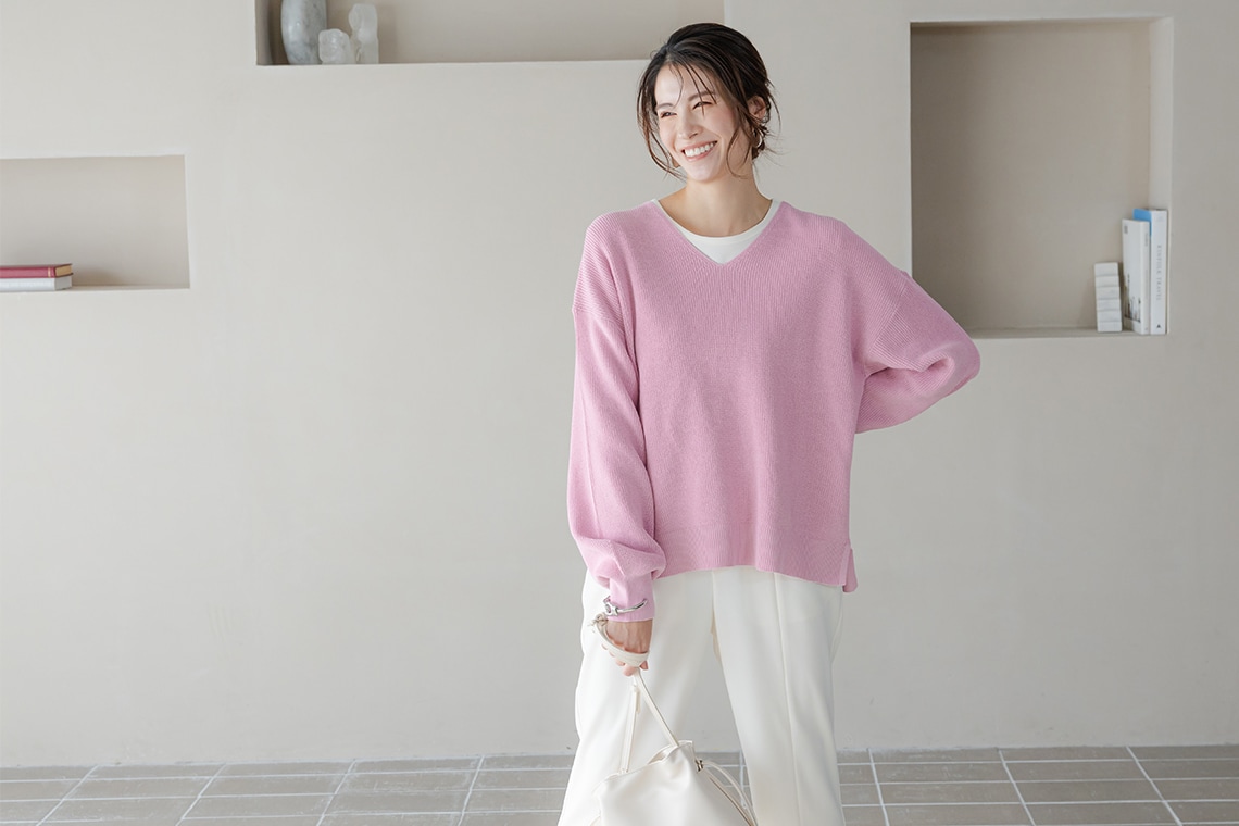 可愛らしい柔らかいピンクが主役のこちらのコーデ。