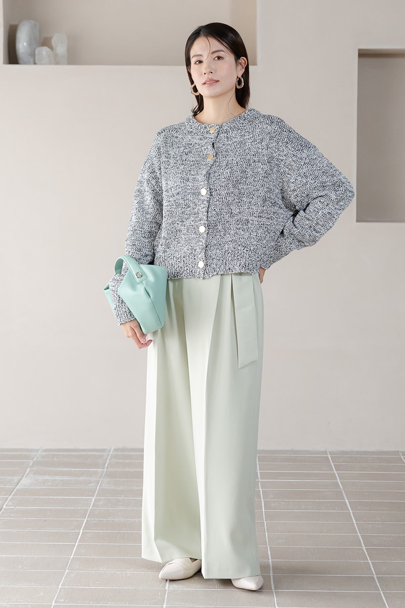 トップスはグレーのミックスカーディガンでマニッシュな印象に。