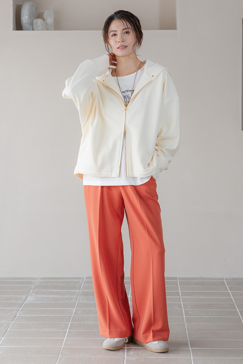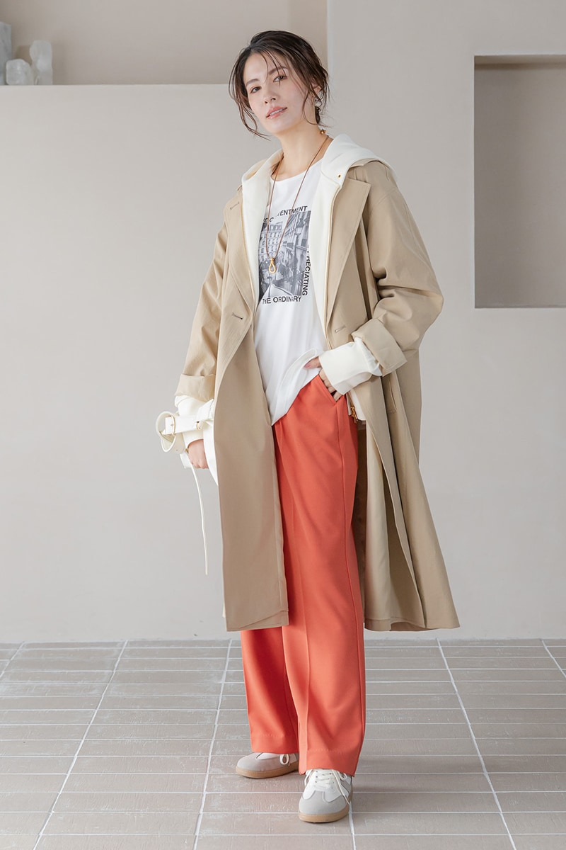 ビタミンオレンジがぱっと目を引くカジュアルコーデ。