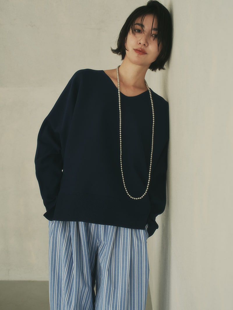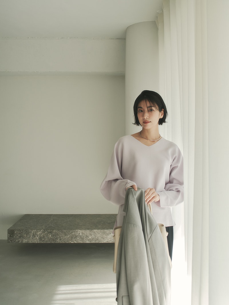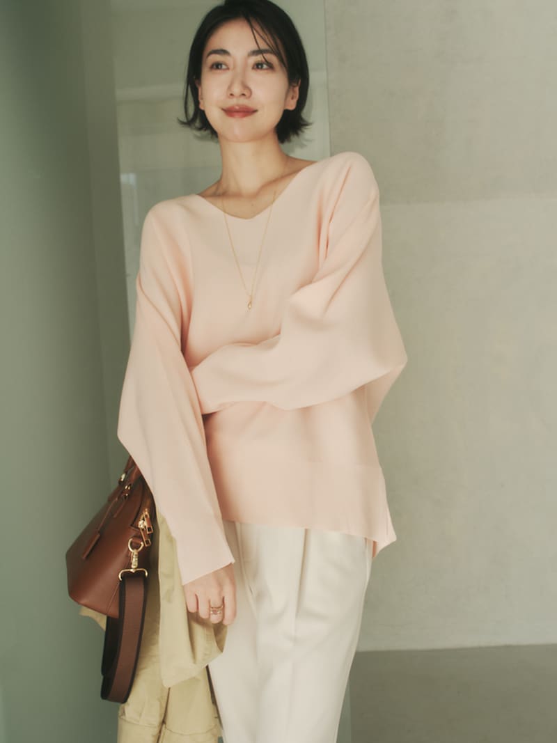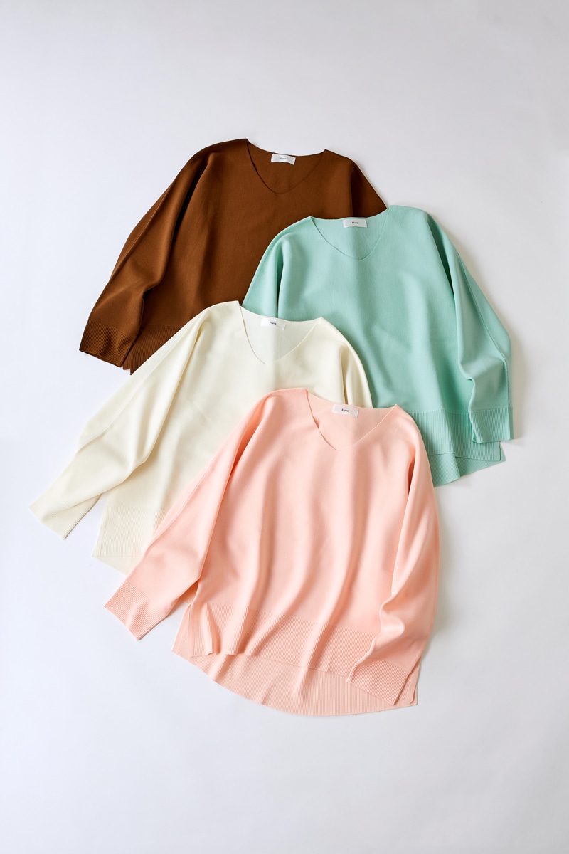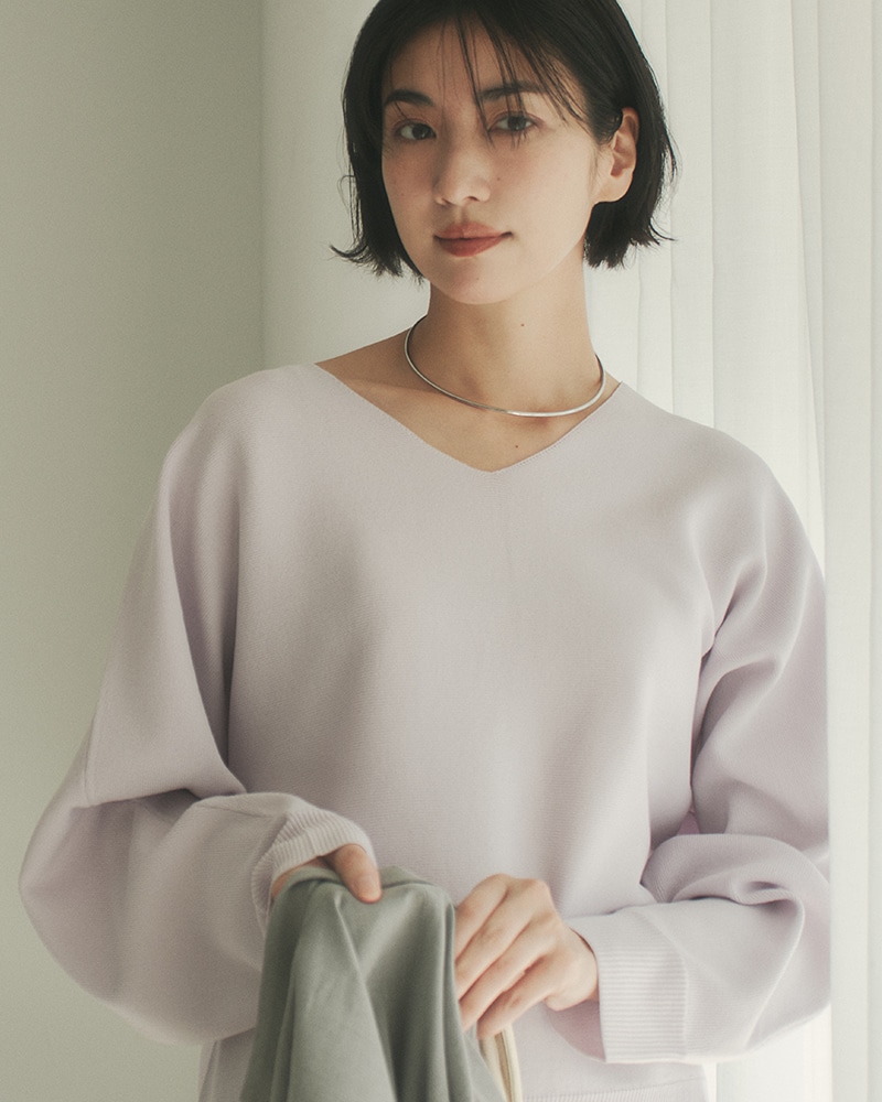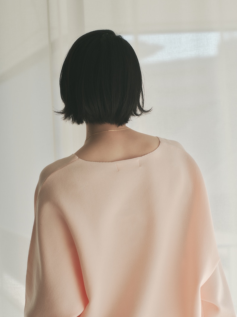 緩やかなシルエットが完成するドルマン袖。お腹まわりなど気になる部分を拾わずに、でもだらしなく見えないバランスにこだわりました。着方を迷わずにさらっと着られる着丈もポイント。